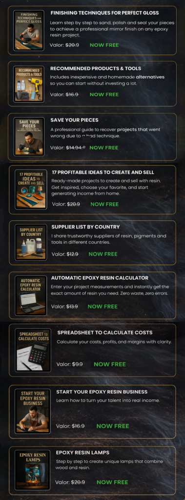 You will learn step by step how to create tables, lamps, clocks and decorative items with epoxy resin from scratch.